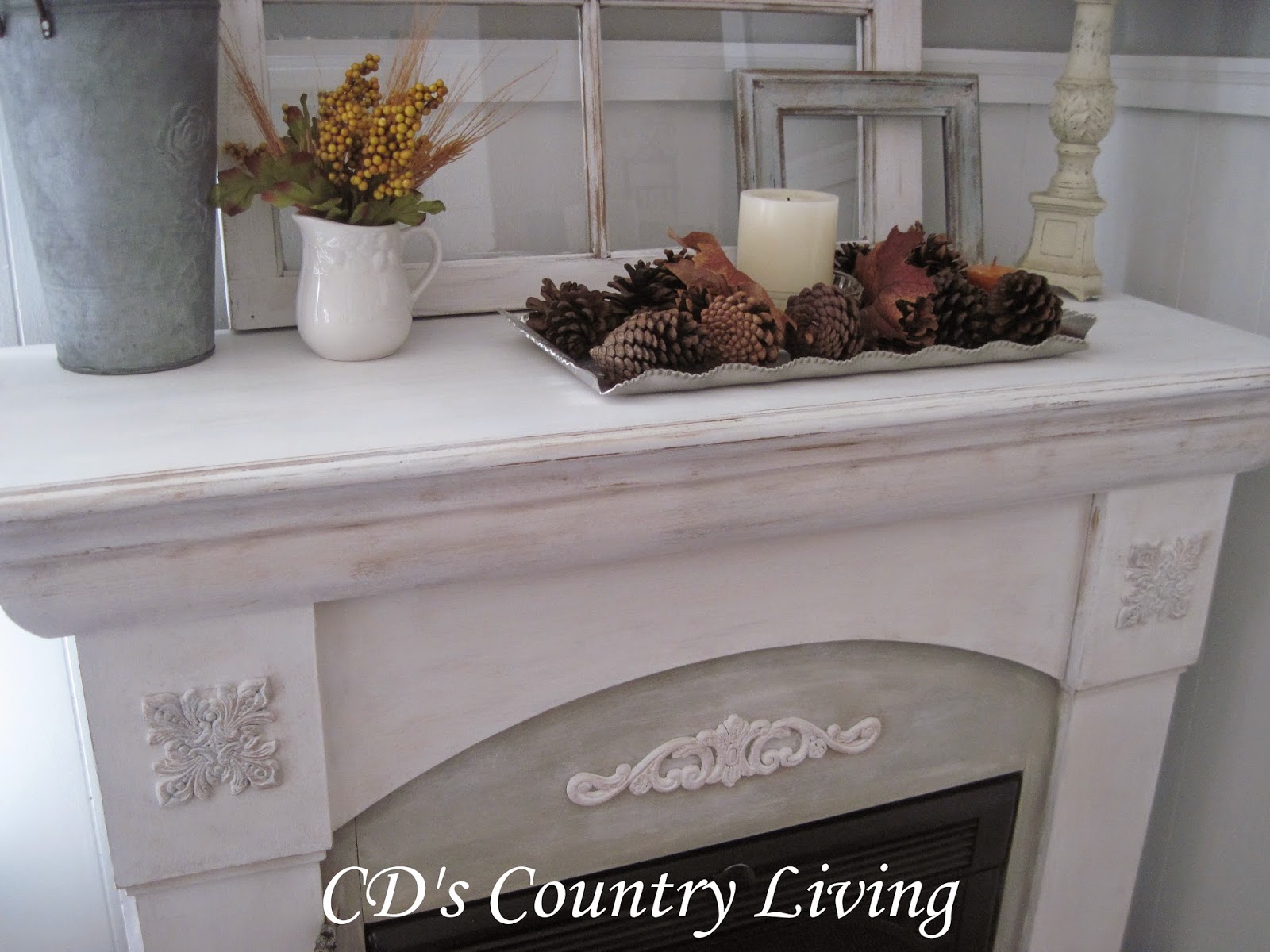 Once that dried, I put two coats of finishing wax on-and then it was time to decorate!!! Nothing fancy-just some branches that fell in our back yard. An old window frame from the farm. A candle with some pine cones-and a faux pumpkin. Simple.