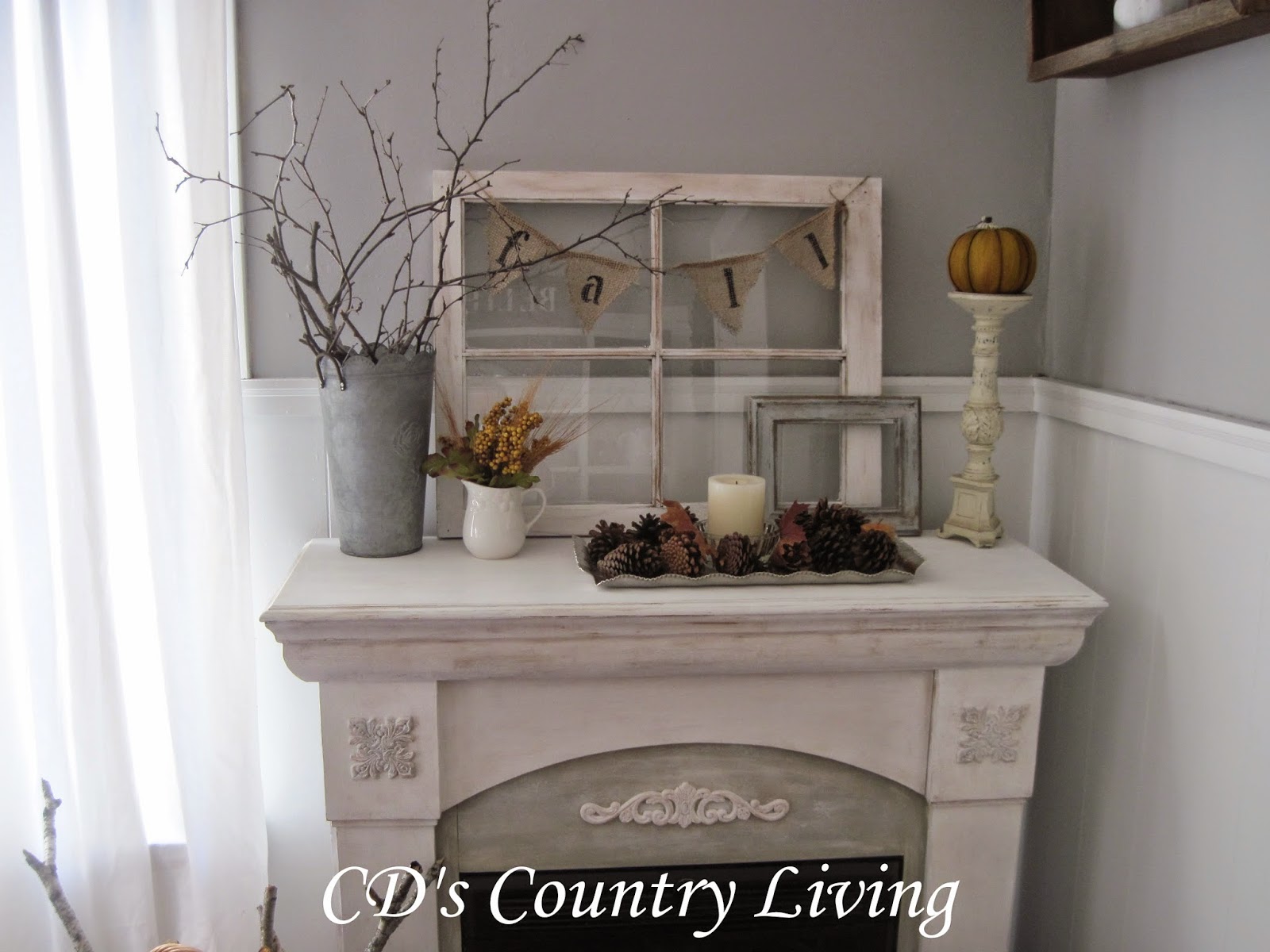 Once that dried, I put two coats of finishing wax on-and then it was time to decorate!!! Nothing fancy-just some branches that fell in our back yard.  An old window frame from the farm.  A candle with some pine cones-and a faux pumpkin.  Simple.