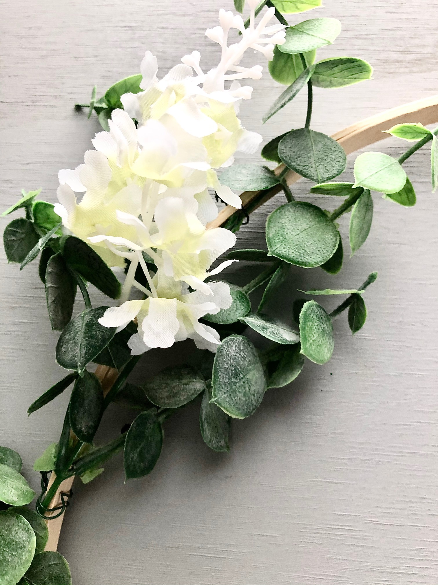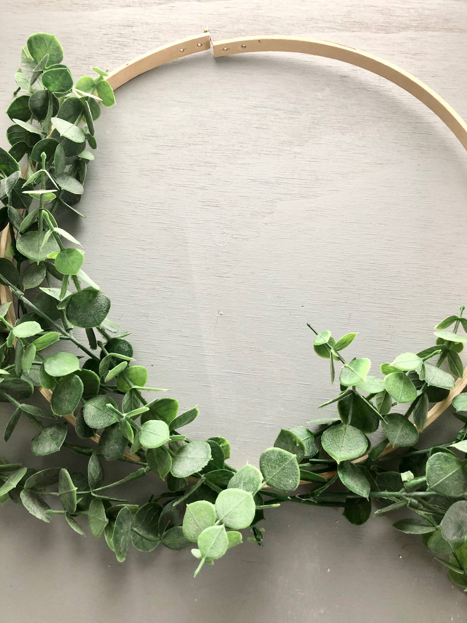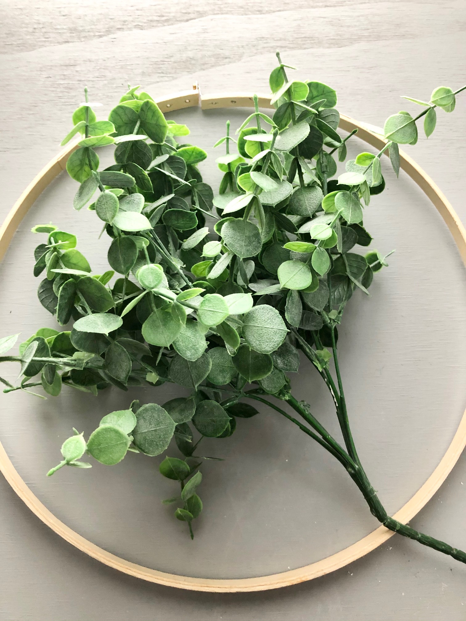 - Continue to add greenery until it looks full and has filled the embroidery hoop the way you want it. (I chose to do cover just one side of the hoop)