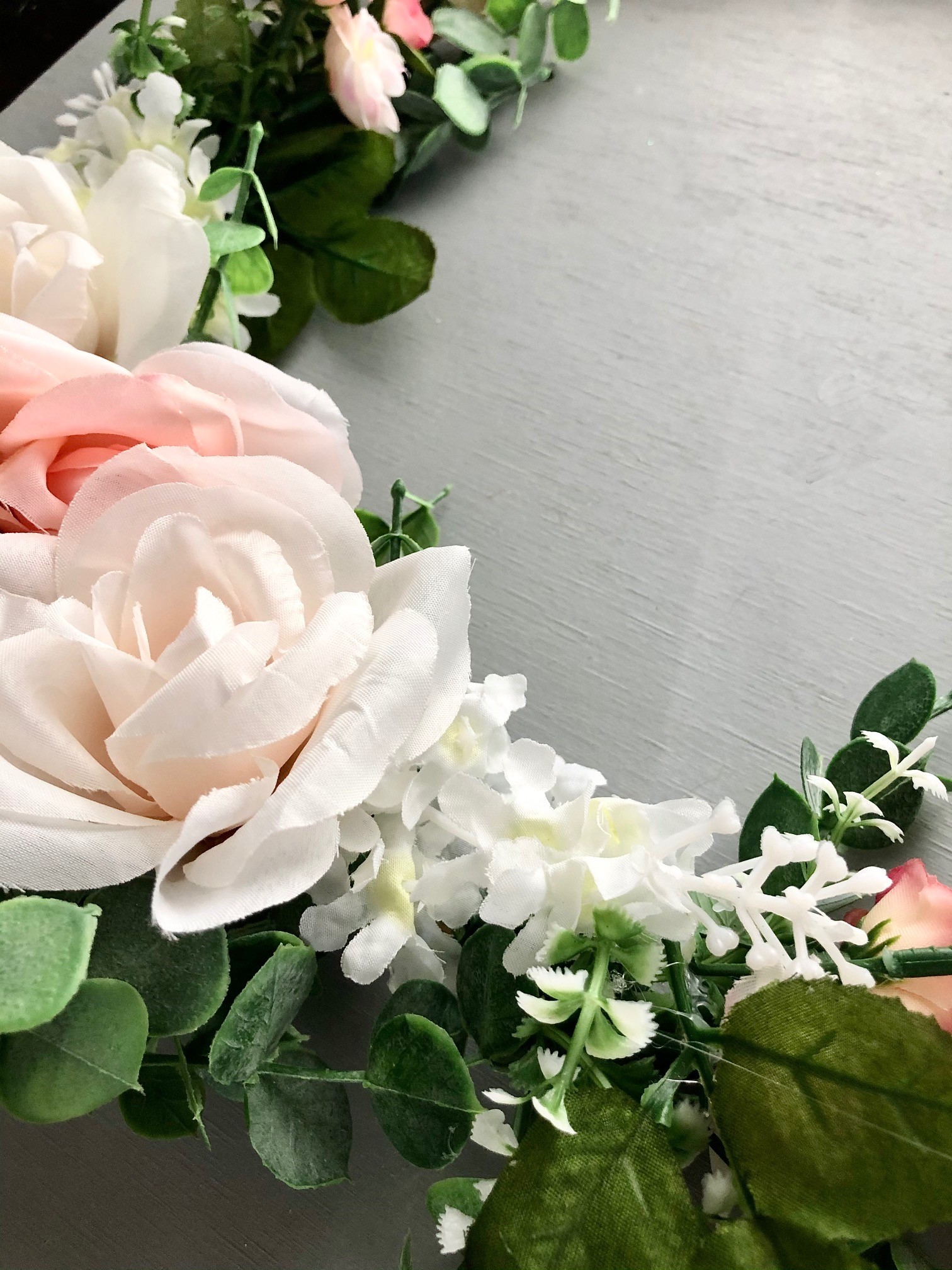 I honestly don’t know why I never made an embroidery wreath before. I absolutely LOVE how this one turned out! And can you believe those GORGEOUS roses came from the Dollar Tree? I just adore all that soft pink against the bright green. It just SCREAMS spring to me.