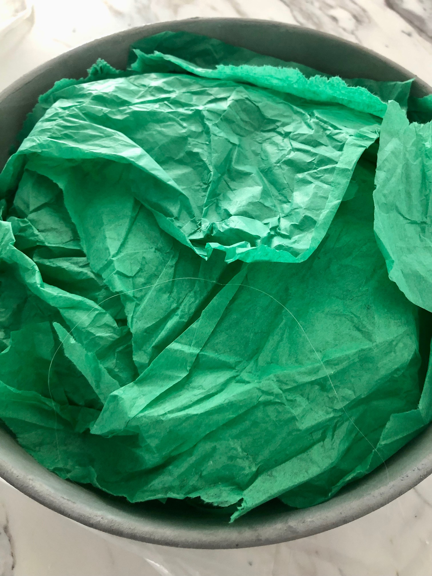 The majority of filler was some Easter grass (shredded paper will do) I had leftover from last year. To add some stability I cut a foam square I had in my craft supplies into fourths and laid them on top of the filler paper. Then I covered it all up with some leftover tissue paper from Christmas.