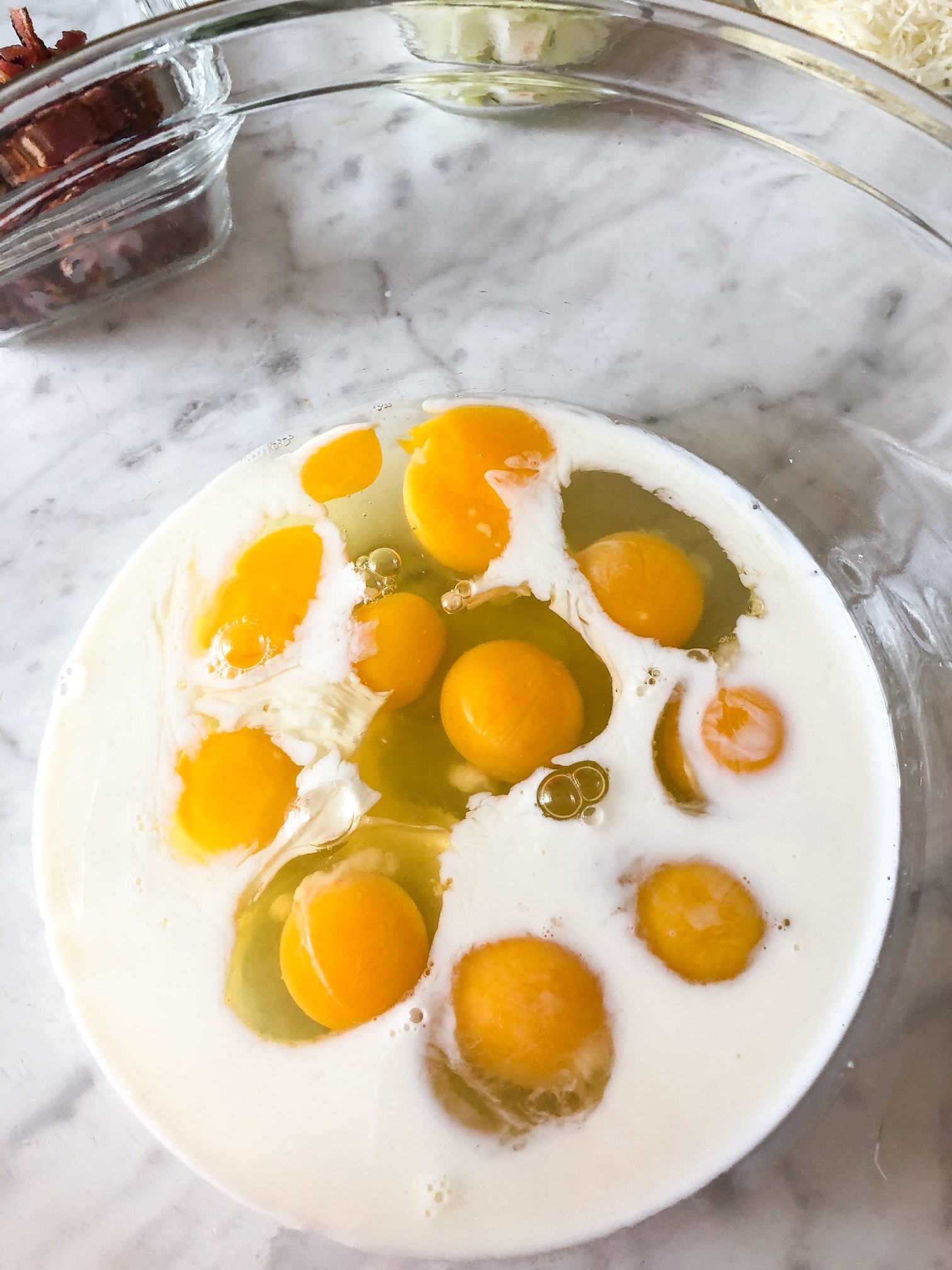 Spoon egg mixture over the top of bacon and hashbrowns-filling 3/4 full.