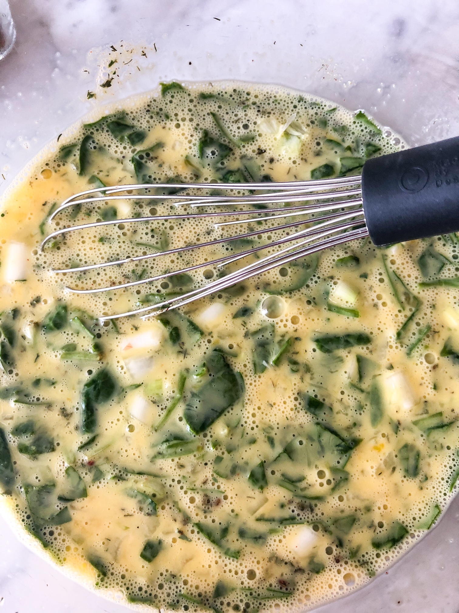 Whisk together milk and eggs in a large mixing bowl. Add in spinach, onions, and seasonings.