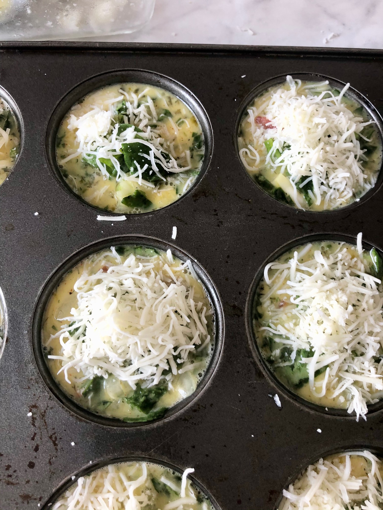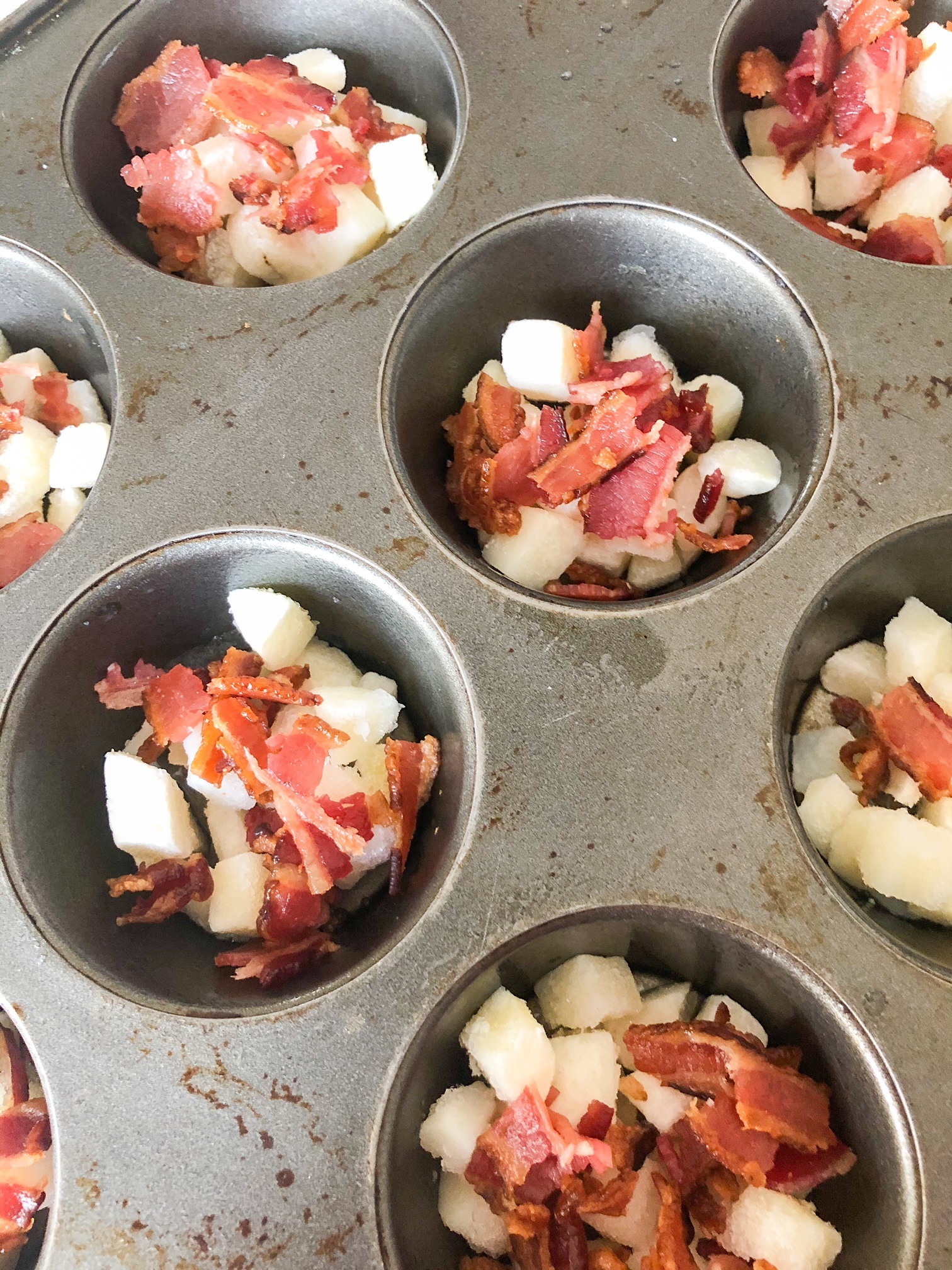 Spoon in equal amounts of bacon(about 1 Tablespoon) into the bottom of a 12 count muffin tin.