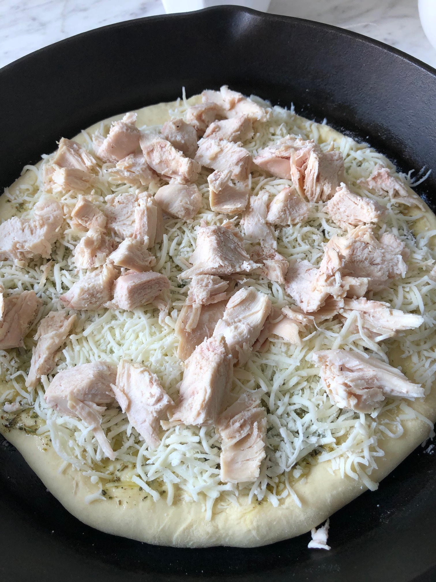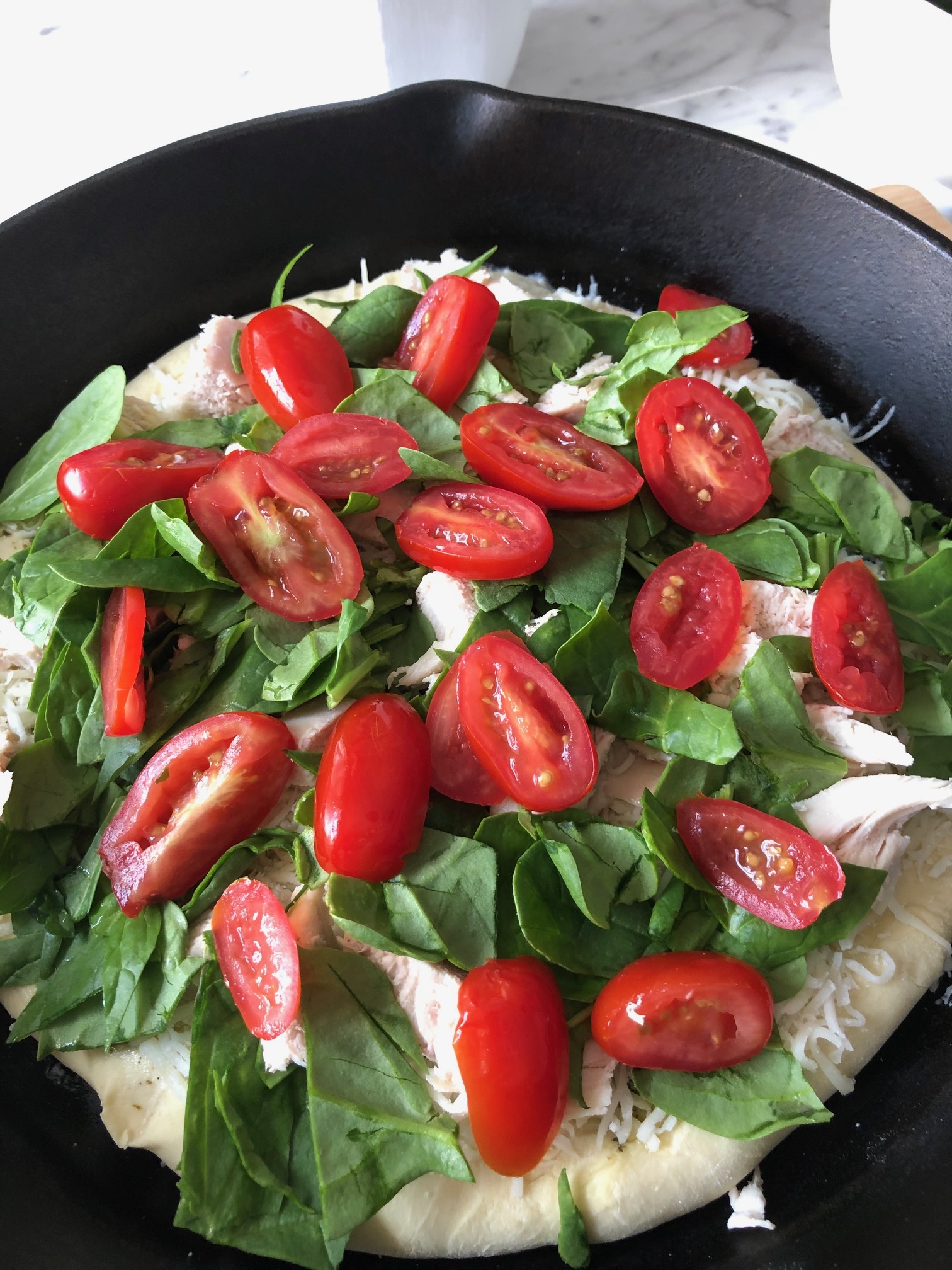 Homemade Pizza Dough Topped with baby spinach, grape tomatoes, roasted chicken, olives, and two kinds of cheese-baked in a cast-iron skillet!