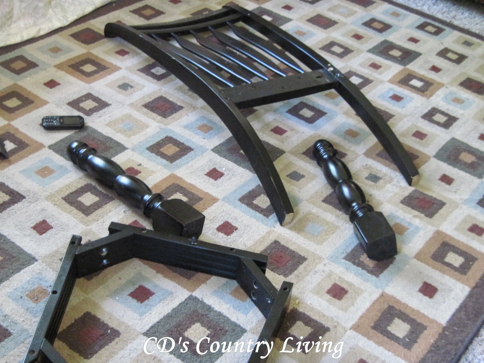 I started this project on our back porch, because hubby was working on his car in the garage, and it was raining outside. It ended up being a bad idea, as you can see by stains on my ‘once’ nice rug! Note to self: Anything manufactured with nuts and bolts is NOT clean, no matter how much you think it is!