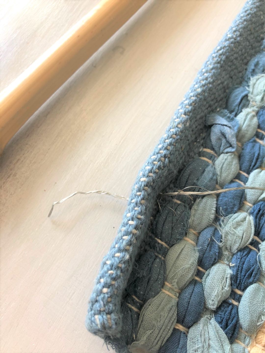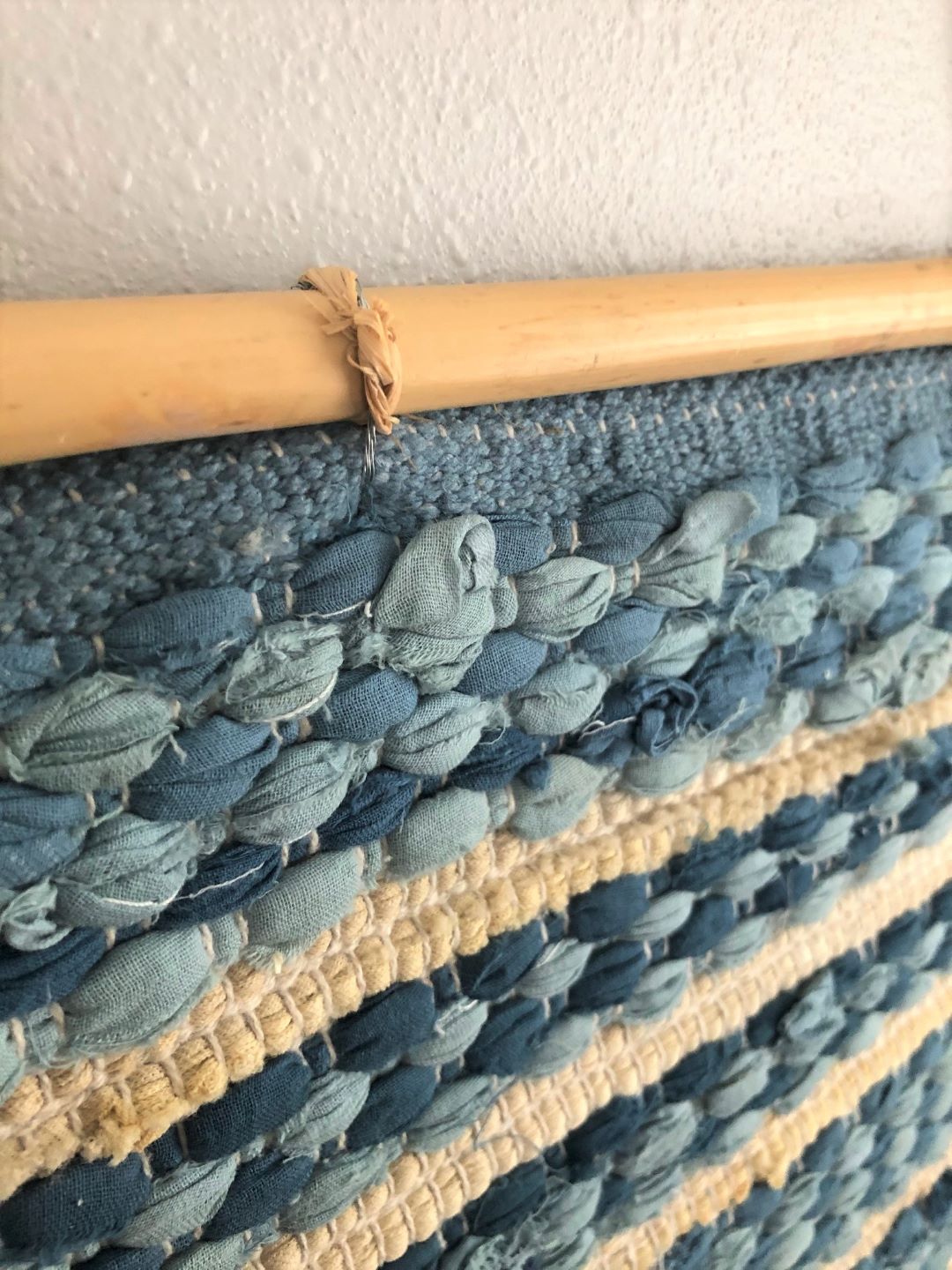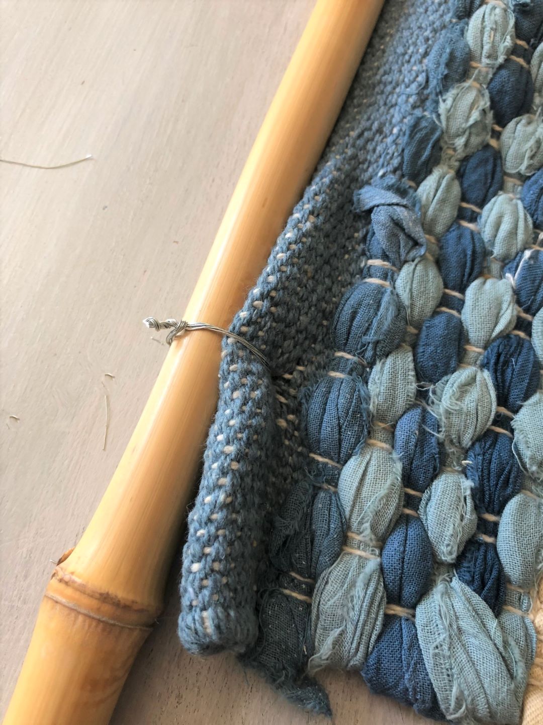 My rod was 30″ long and my rug was just over 20″. So I aligned the rug to the center of the rod and then it was ready to be attached. For this, I cut a piece of wire and pushed it through the top of the rug. Then I wrapped it around the rod several times and cut off the excess wire.