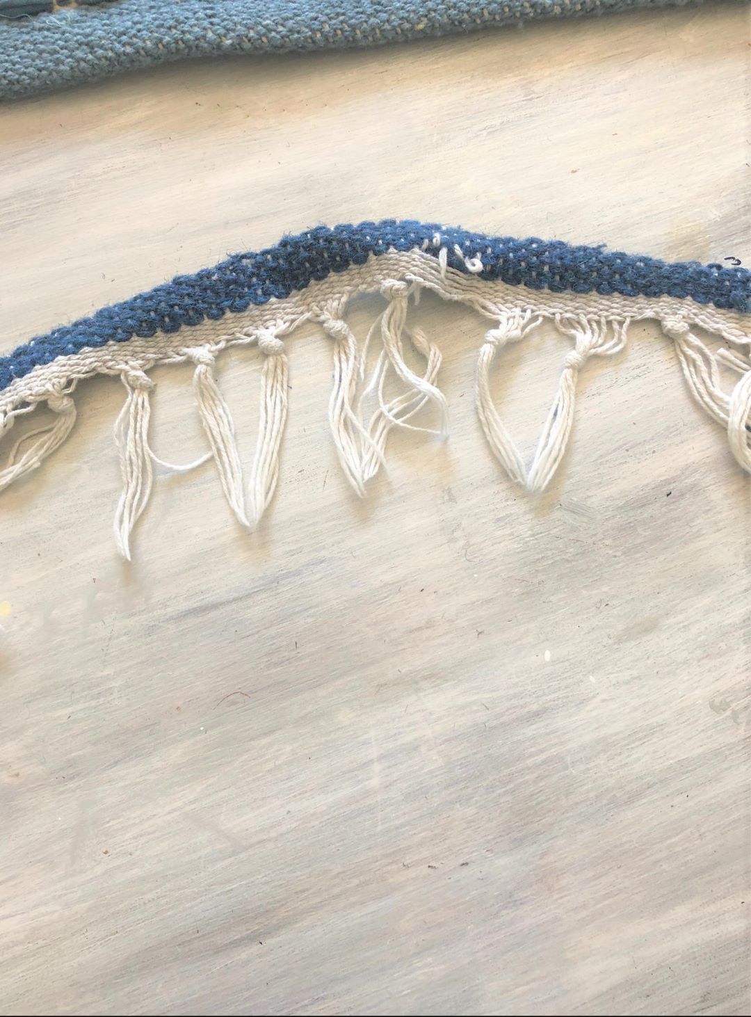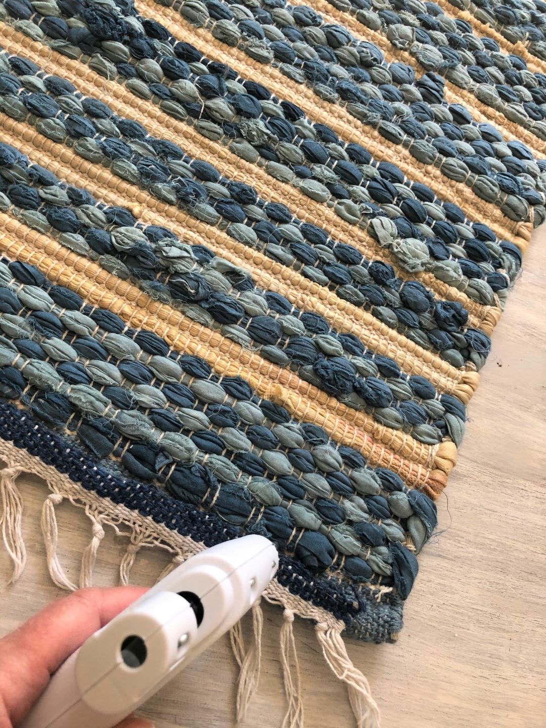 If you’re lucky you might just find a rug WITH a tassel. Mine did not have one and I couldn’t find any at our Dollar General so I improvised. I had an old rug that was also in my ‘donate’ box from the basement. It had TWO tassels, so I cut them both off just in case one wasn’t long enough. It was!! Since I had to cut it thick enough to fit on the end of my rug, I was also grateful the blues matched! All I had to do to attach the tassel was put a strip of glue down on the bottom of the rug and lay my tassel down. Once it was pressed firmly in place, I moved on to the top of my rug.