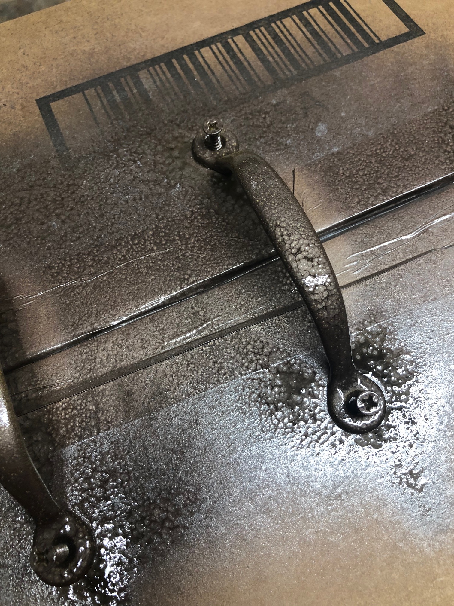 I had these drawer pulls on hand from another project we did (extras). Obviously green was not the color I was going for. LOL! You also can get them in bronze, black, silver, etc.(See above in materials.) I decided on bronze for mine because I love the look of that against the wood. TOTAL: Two coats (1 hour drying time in between)