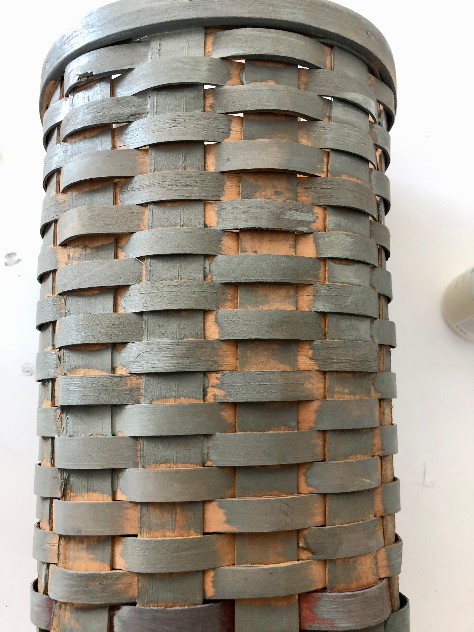 - Add the base coat. I gave my basket one coat of the pewter gray using a sponge brush. Then I let it dry for 15 minutes. TIP: It’s not really important at this time to get into all the cracks and crevices with the base coat. You’ll be adding additional coats that will do that.