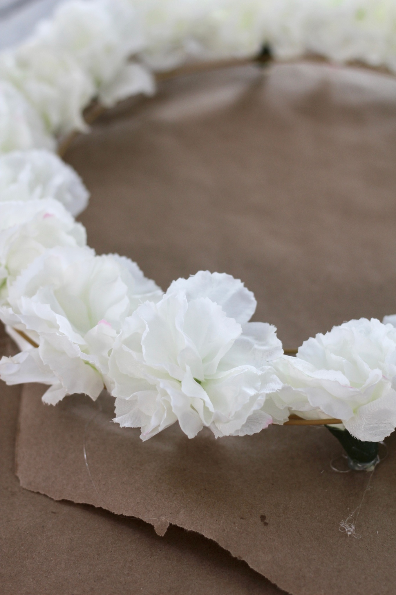 - Begin by plucking the flowers off of the stems. Then lay them out on the wire wreath form to see exactly how many you will need. NOTE: You just need to cover the outer ring.