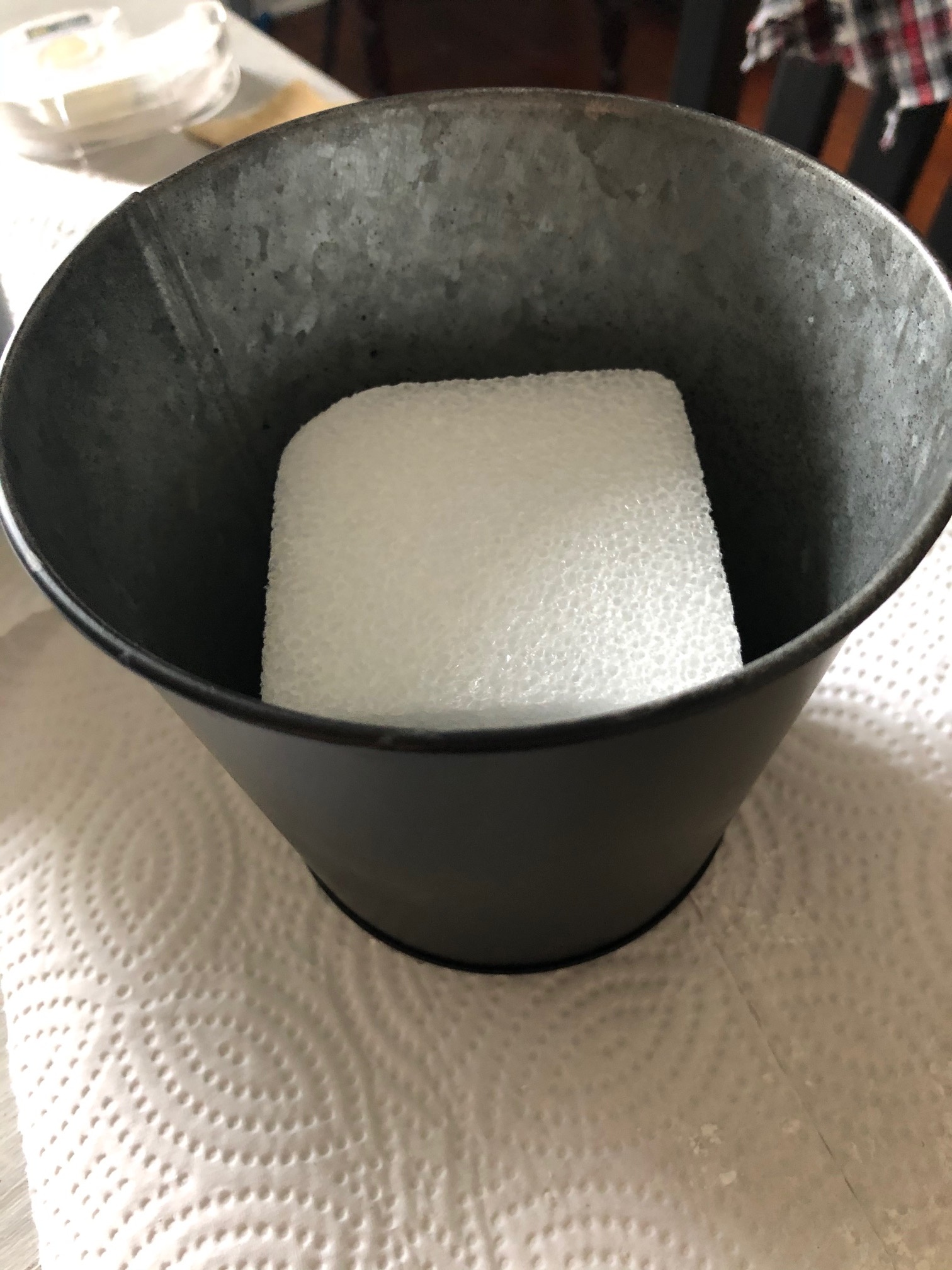 I first gave each bucket a light coat of black spray paint. I let that dry for 1 hour and then applied one more light coat. Once that dried (about 1 hour) I placed the Styrofoam square inside the bucket and then it was time to decorate.