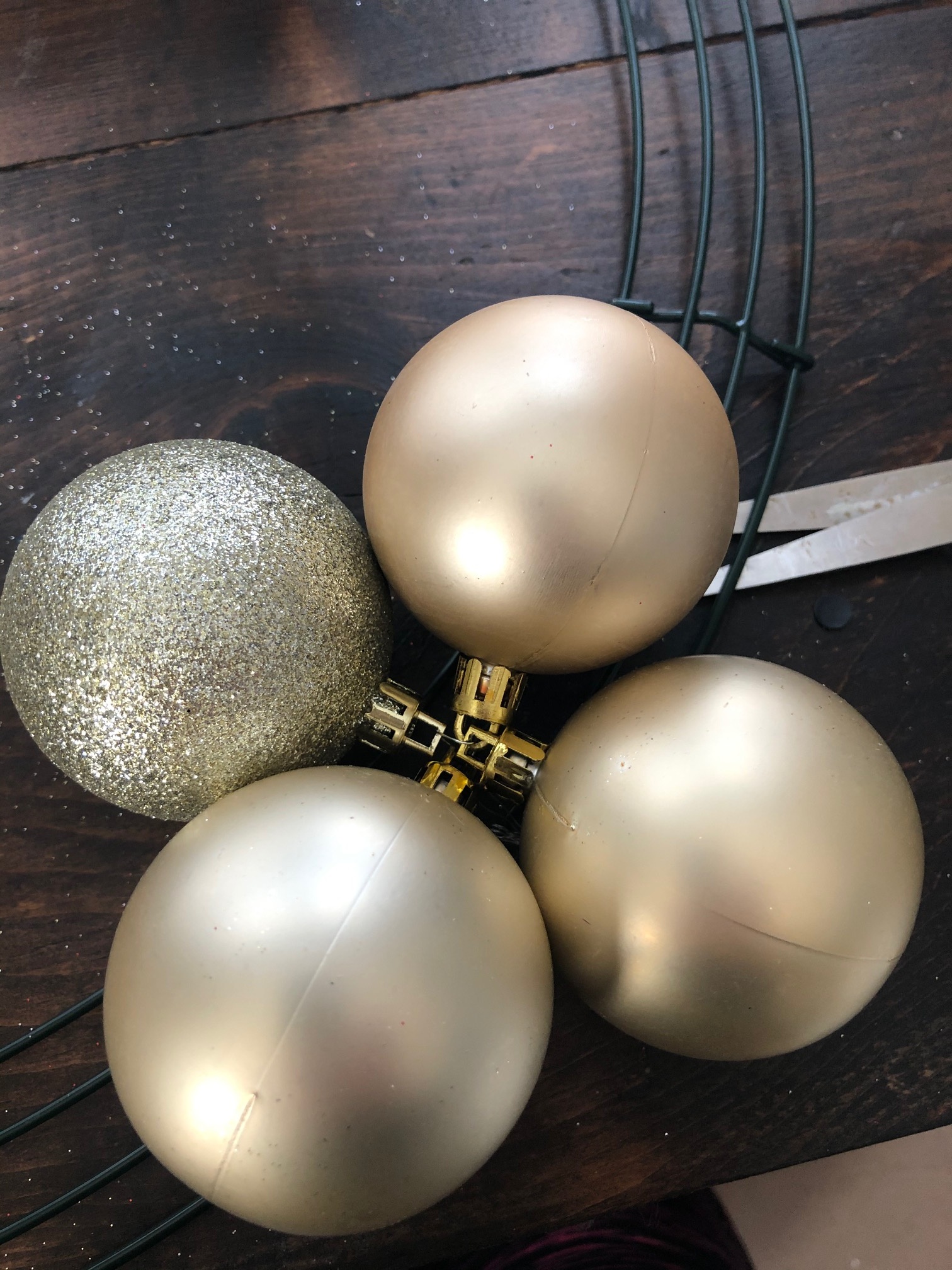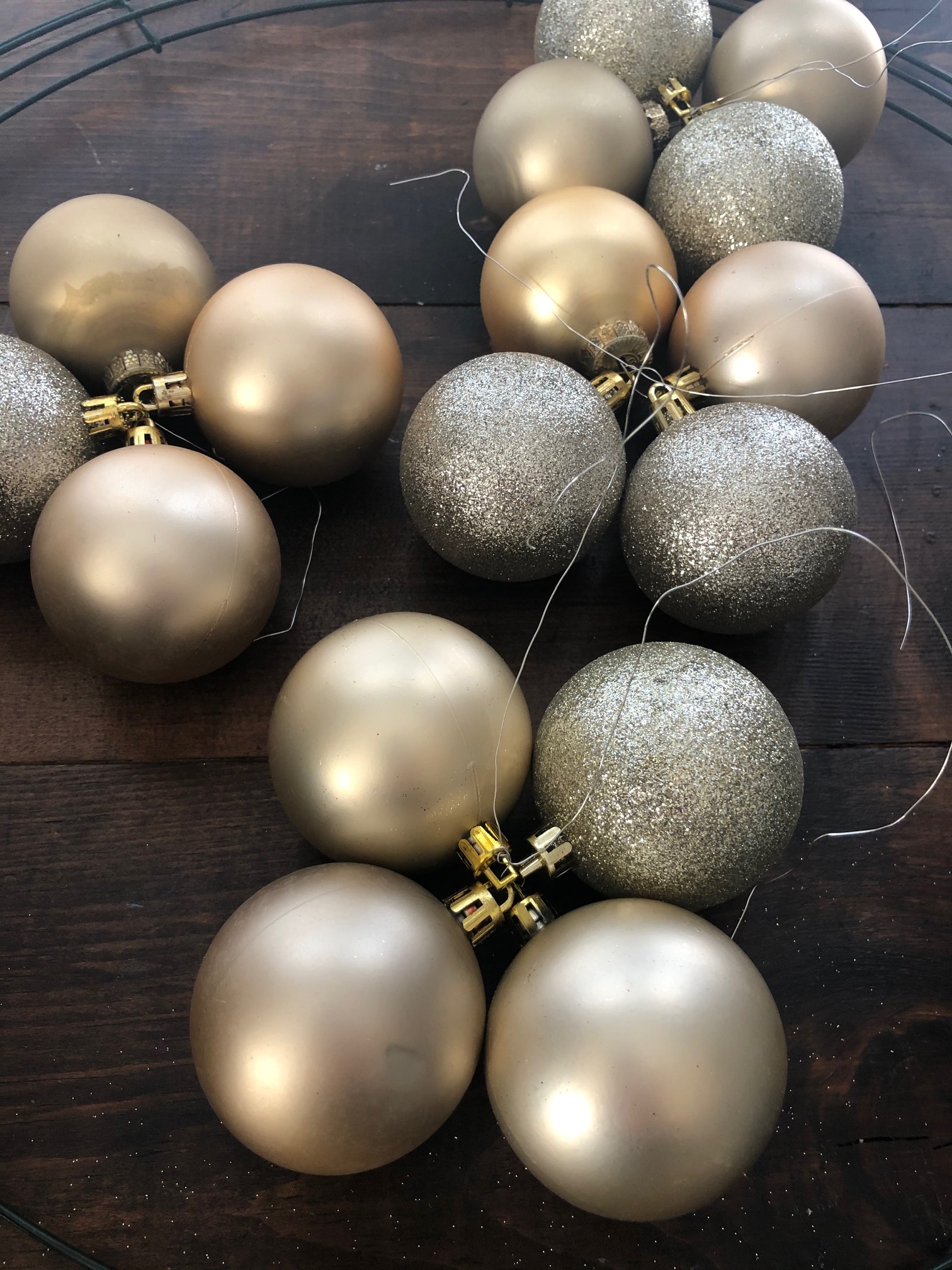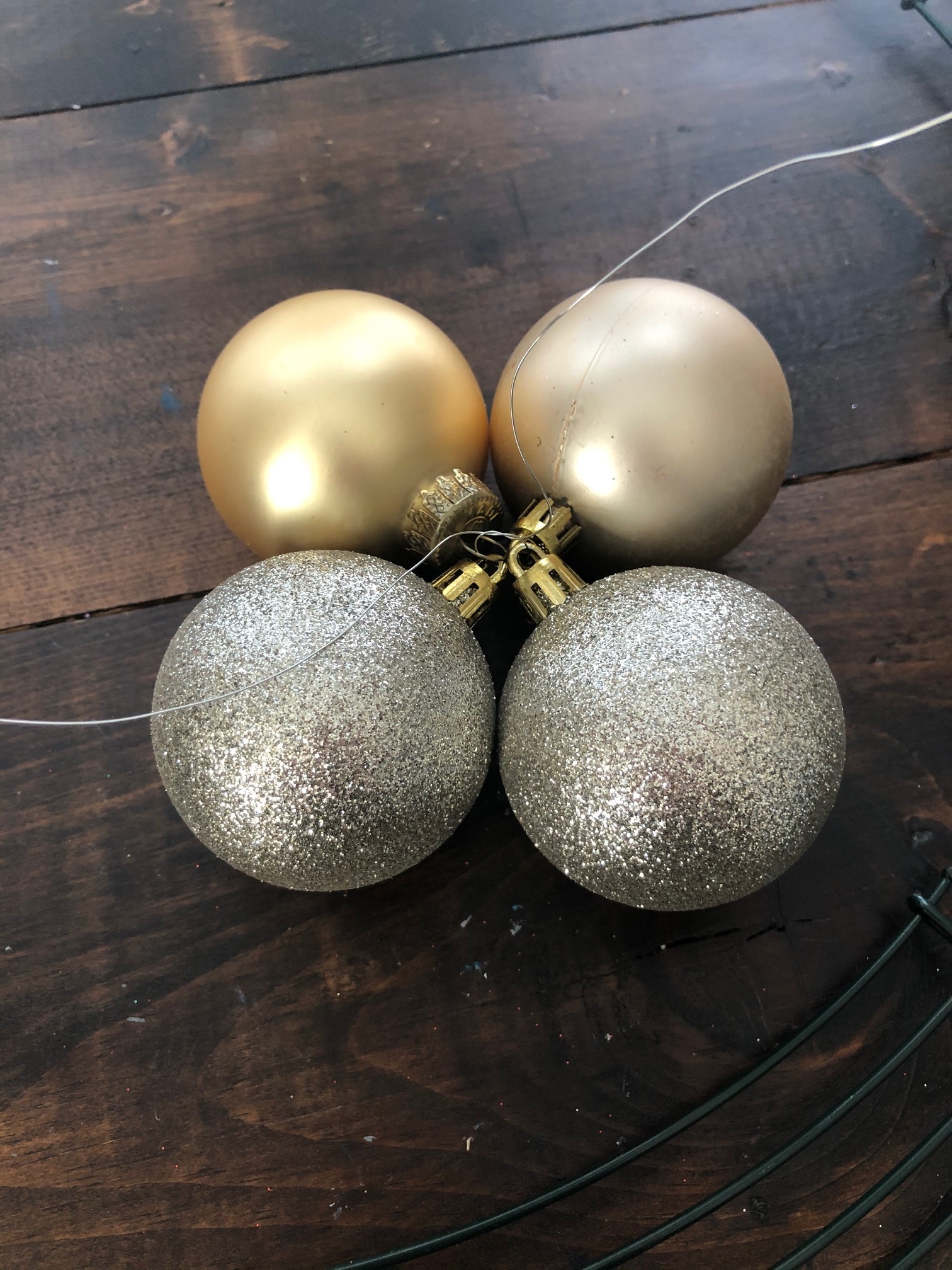 To start you will need to string four large Christmas balls together. I chose two champagne gold and two silver glitters for two groups of four, and three champagne gold and one silver glitter for two groups of four. For the size of the wreath form I had, I needed four groups of four total.