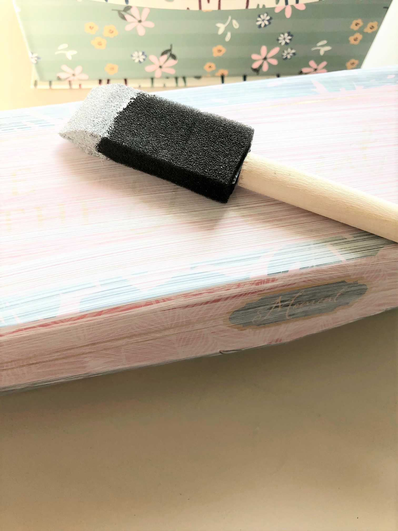 - I started with the top of my box. First, I sprayed the top and back with my adhesive spray. (Do this in a well-ventilated room it’s kind of stinky) Then I laid my shelf liner down (keeping the edge straight with the edge of the top of my box) and wrapped it around the back of my box.