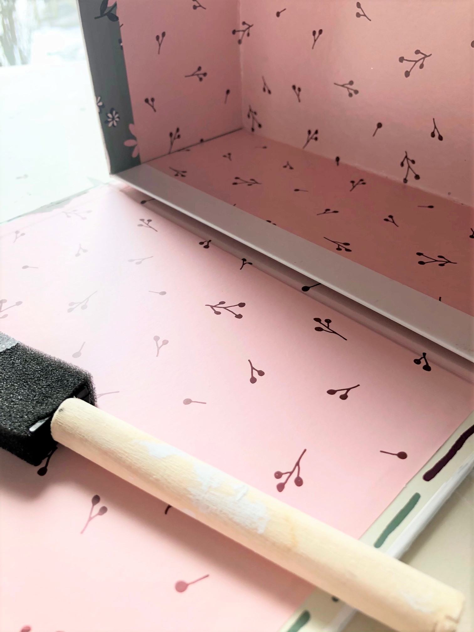 Now of course this is totally optional if your box is the same color as the shelf liner. Or, if you’re using a darker colored shelf liner that will cover up the box. In my case, I had to cover up both the inside and outside. I chose this soft moss color for the inside!