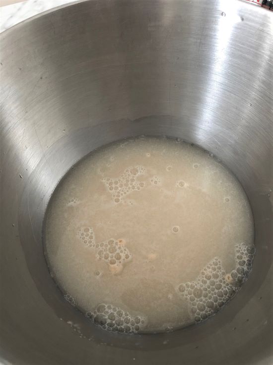 First, we are going to activate our yeast by dissolving it in warm water and adding in sugar! If your yeast is good, you should see the mixture start to bubble almost immediately. Within seconds it will begin to foam and folks we’ve got active yeast!