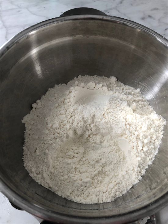 Now it’s time to add the flour and salt. I usually pour half of the mixture into my stand mixer (just so I don’t have flour everywhere) and then I add a bit of melted butter. Once that is mixed in I add the remaining flour mixture. You’ll notice the dough start to pull away from the bowl by this time. That’s a good thing!!!