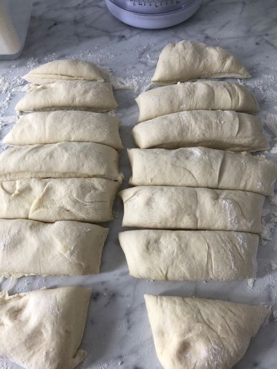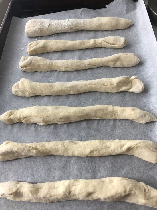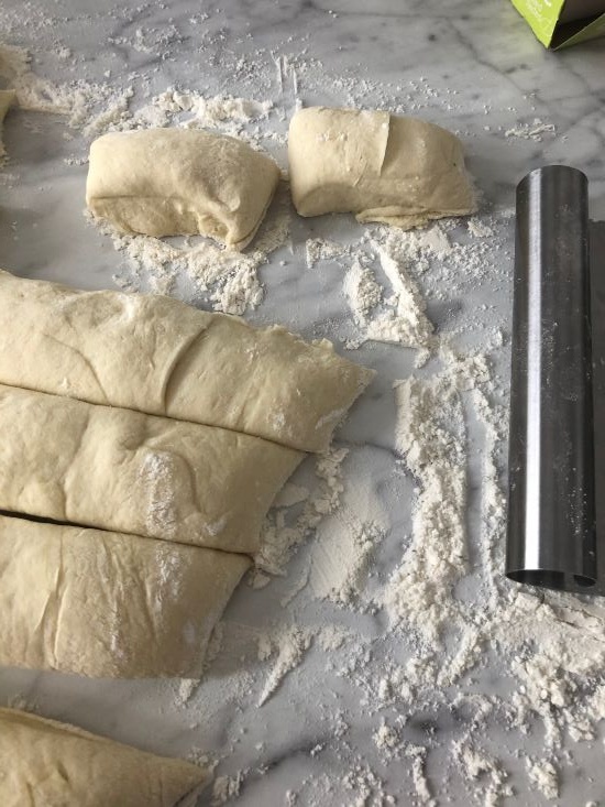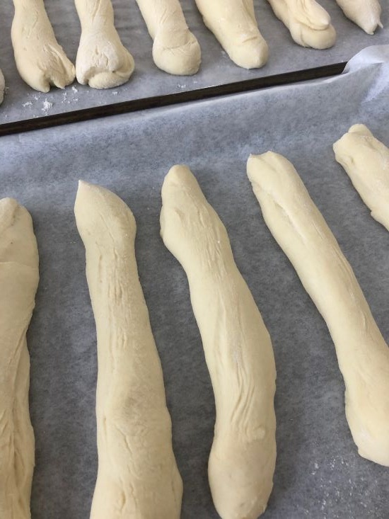 If you’re going to make all breadsticks with this dough then go ahead and roll it out on a well-floured surface. Then cut it in half with a pastry cutter. Then cut those halves into strips and then cut those strips in half. Got it? Good! Now you should have twenty-four chunks of dough to roll into breadsticks!
